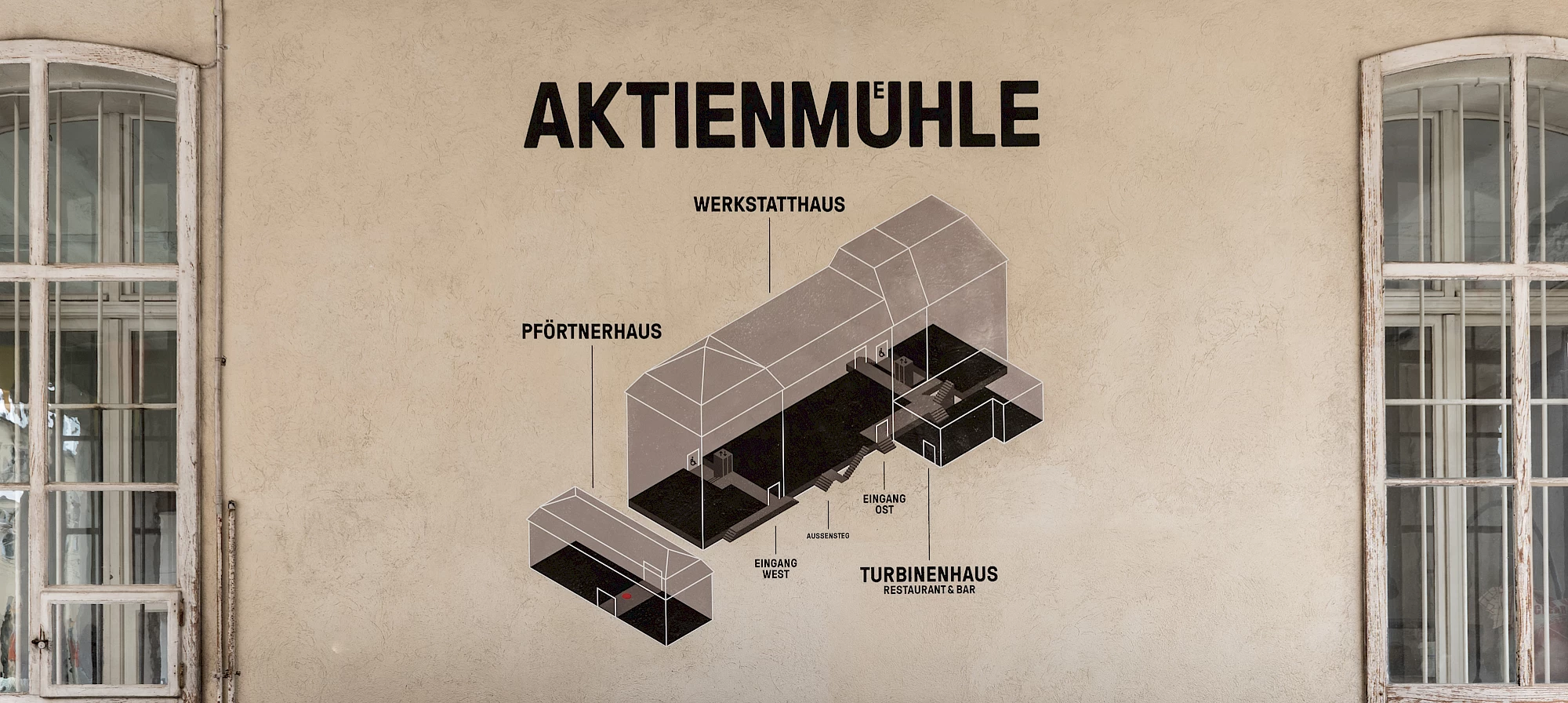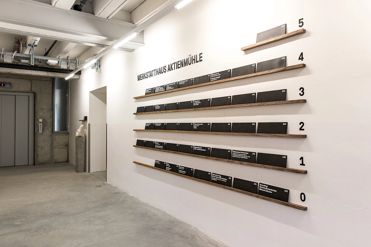 The Aktienmühle workshop house offers 5 floors of space for craft enterprises. During the restoration process of the 100-year-old mill, great care was taken to maintain much of the historic building fabric and its original feel. A metal label will be placed on a wooden rail in front of every workshop and will offer a small presentation area for the tenants. Both entrance areas will include two overview tables to present all workshops and direct visitors to their destinations.