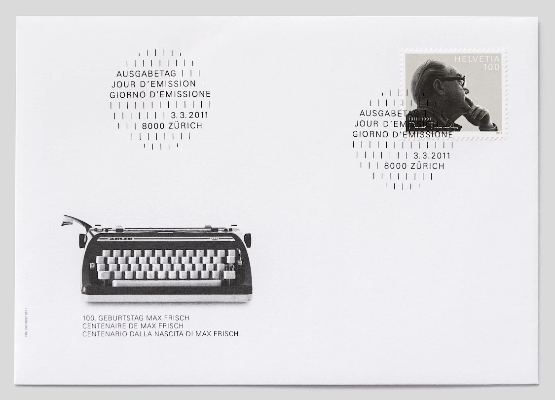 On occasion of the festivities for Swiss author Max Frisch’s 100th anniversary, we designed in 2010 a commemorative stamp for the Swiss Post. Frisch’s sober writing style is mirrored in a clean and sober stamp. We opted for a portrait of the author by Fernand Rausser, to reference two important themes of his work. On the one side, the silhouette references the topic of the search for identity, while on the other side the pensive look in front of a neutral background and the word “Helvetia” symbolizes the intensive critical focus with which the author approached his home country.