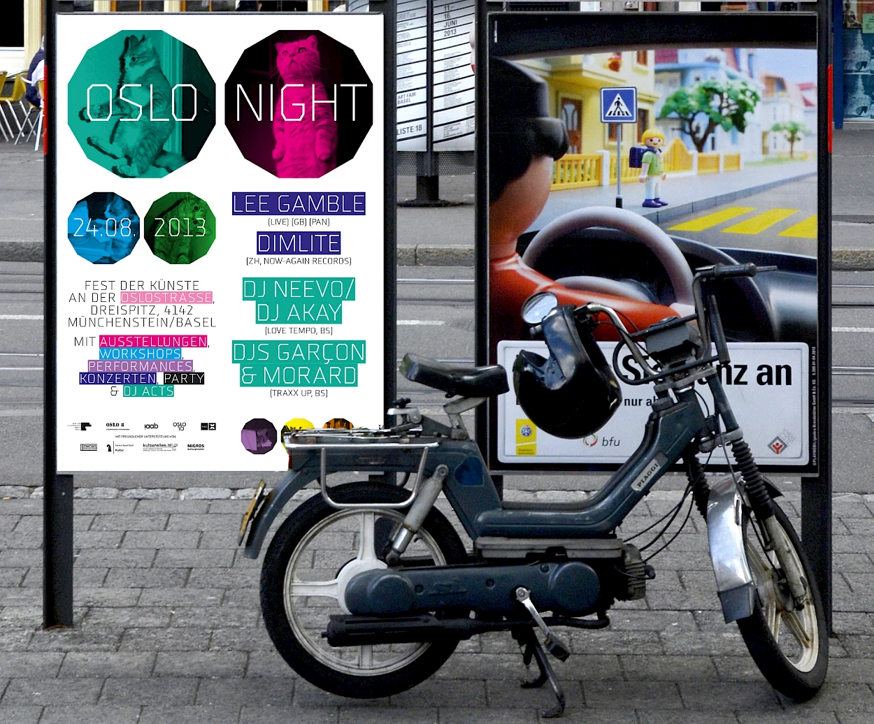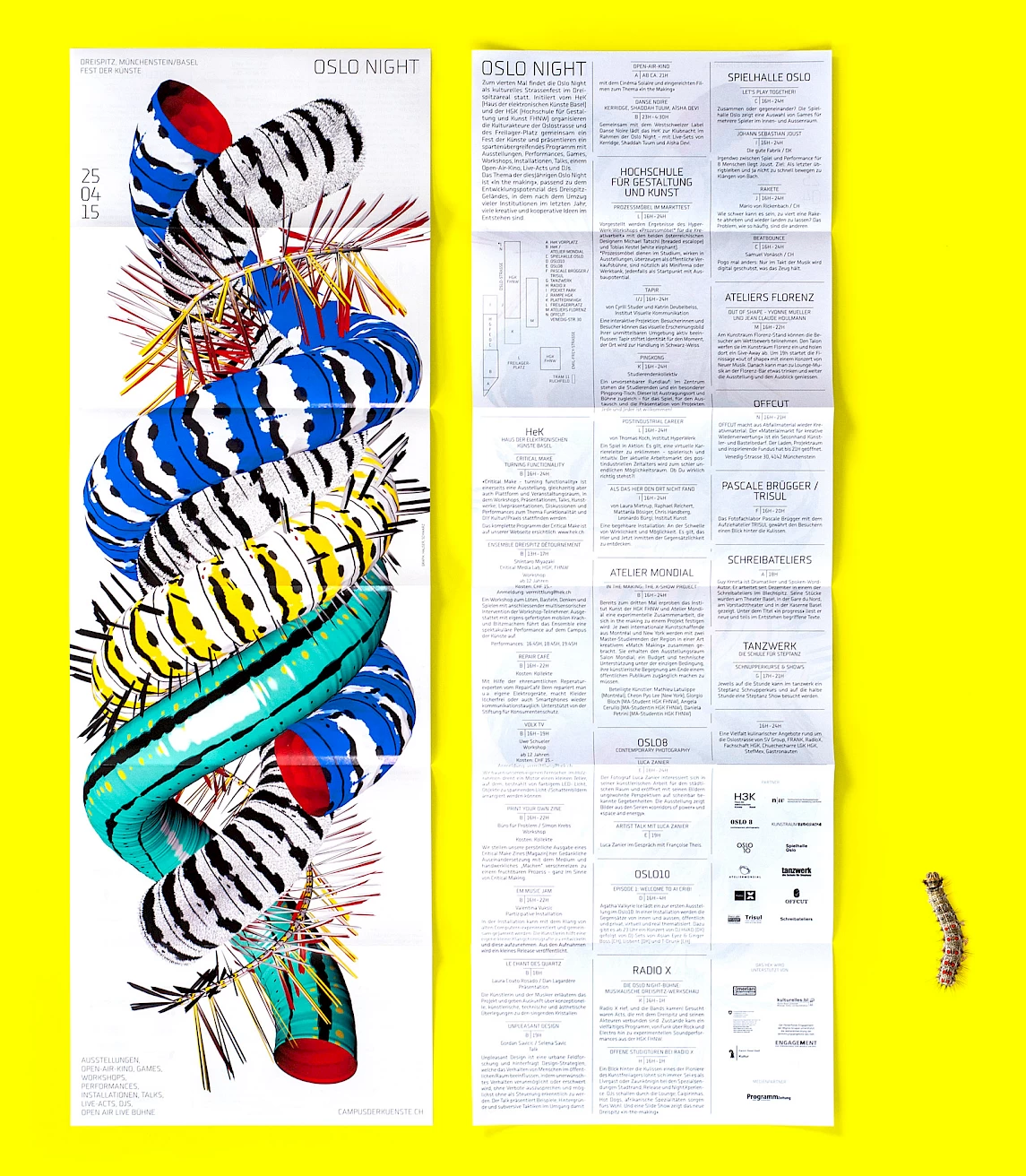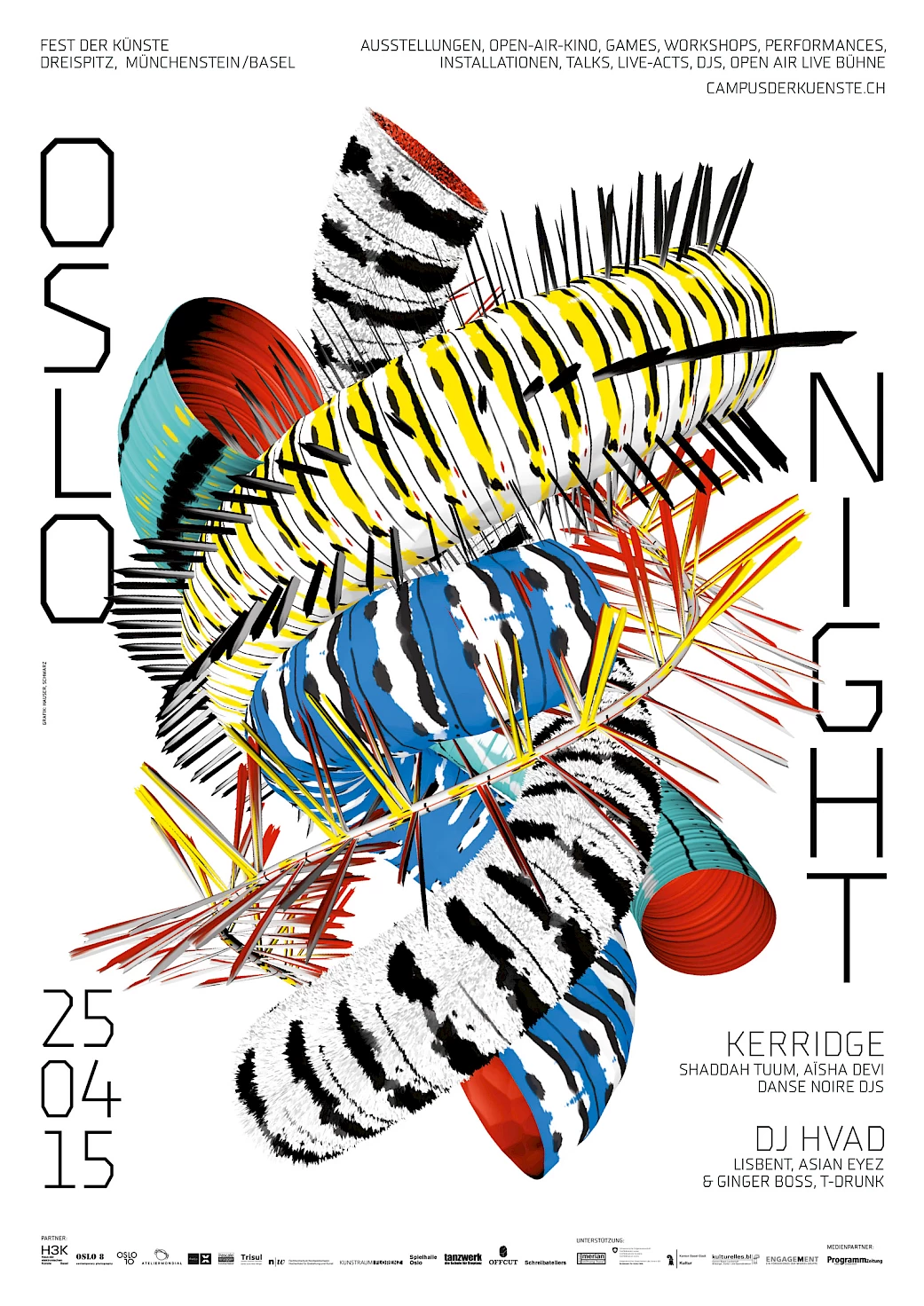 In occasion of Oslo Night, the tenants of Oslostrasse and of the Freilager Platz organize an art festival, presenting a broad program of activities that includes exhibitions, performances, games, workshops, installations, conferences, an open-air cinema, live music and DJs. The now revived and vibrant area’s motto for 2015 was “In the Making”. The coil of tangled caterpillar-shapes gave the event and the motto the appropriate visual appearance.