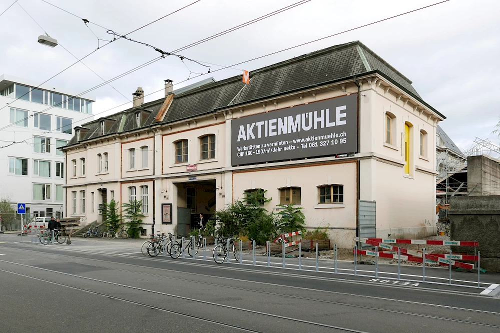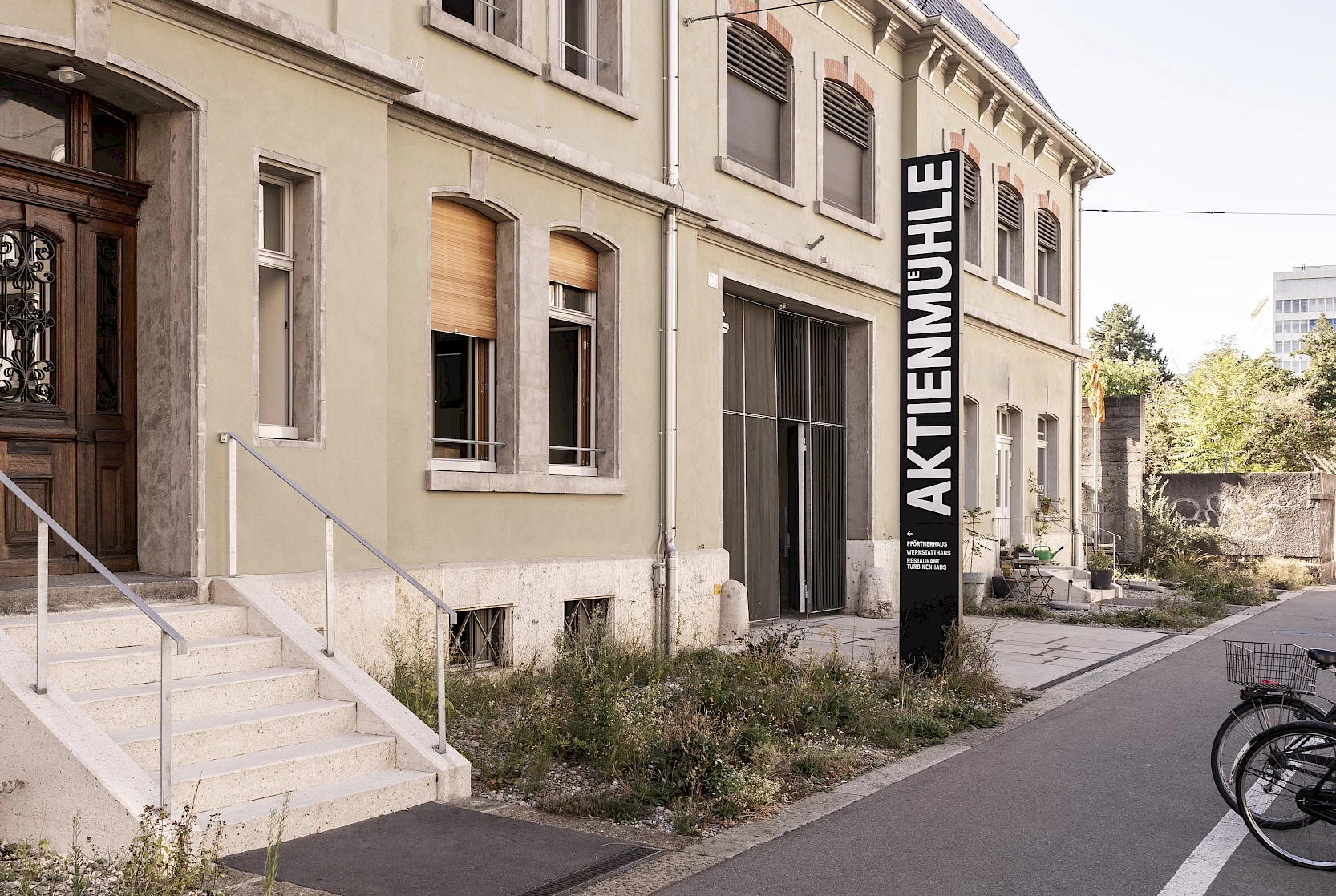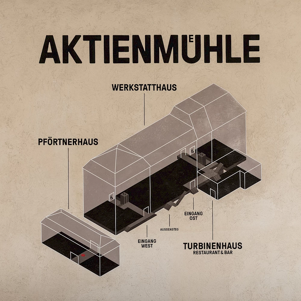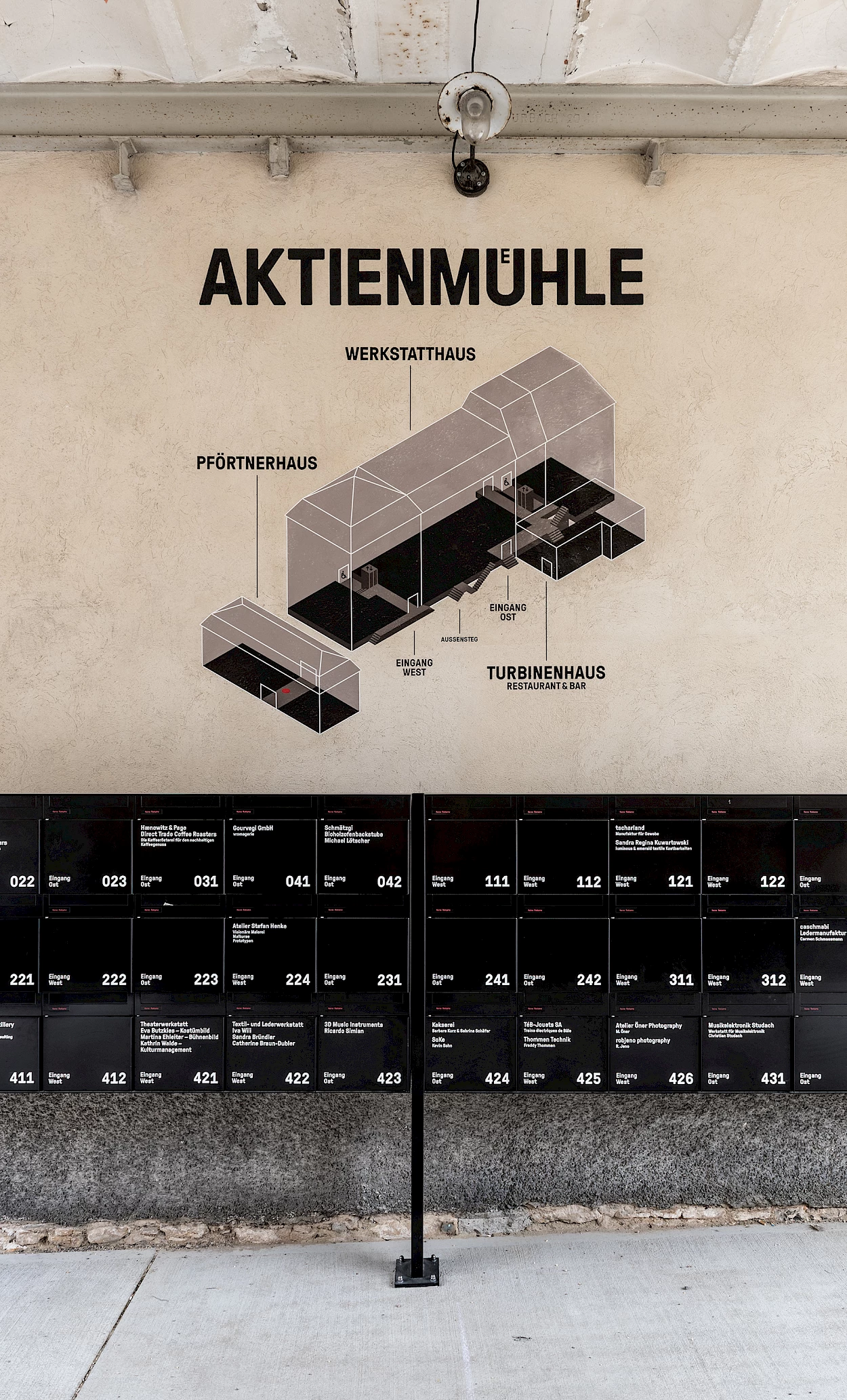 L’immeuble sur cinq étages Aktienmühle propose des ateliers pour entreprises artisanales. Lors des travaux de rénovation, une grande partie du bâtiment a été conservée dans l’état d'origine. A l'entrée de chaque atelier se trouve une liste en bois, servant à la fois de support pour un écriteau en métal, ainsi que de place de présentation individuelle pour les locataires. Aux deux entrées principales, une vue d'ensemble oriente le visiteur vers l'atelier recherché.