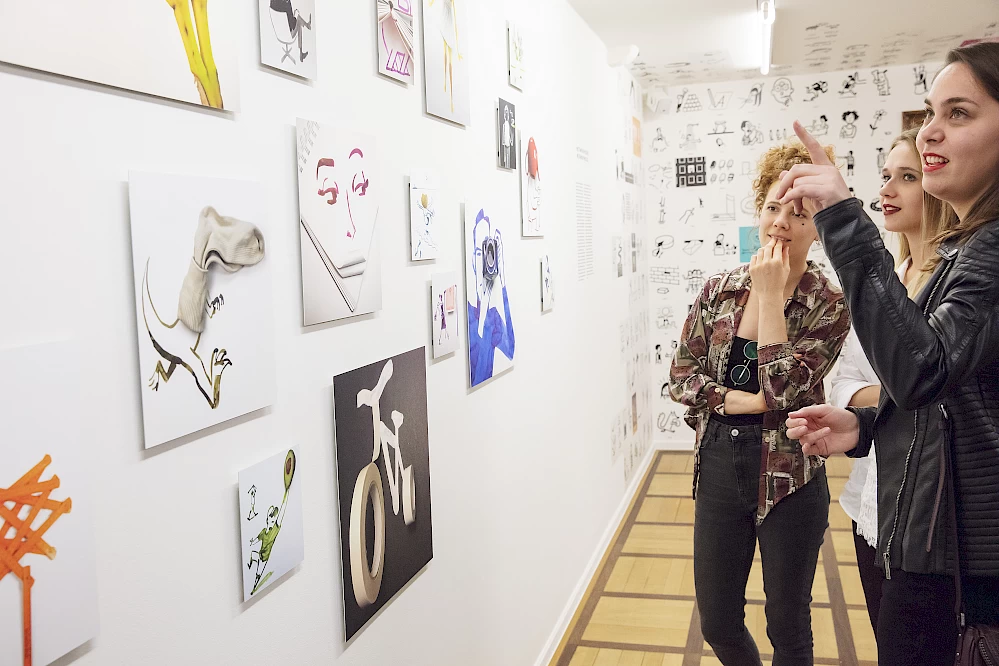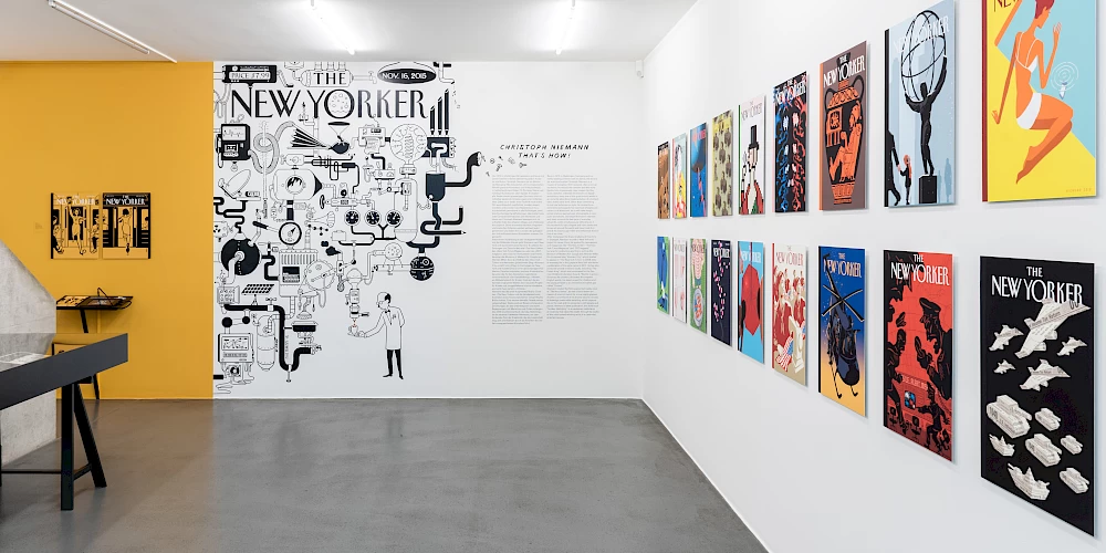 La rétrospective Christoph Niemann – That’s How! au Cartoonmuseum de Bâle présente une oeuvre particulièrement variée. La richesse stylistique ne se déploie pas uniquement en impressions, dessins originaux ou muraux, mais aussi en formats digitaux tels qu'animations, applications interactives et réalité virtuelle. Outre une couverture de magazine agrandie et complétée par l'artiste, un livre de 350 pages décliné en tapisserie, on peut découvrir l'image murale Live Drawing the New-York-City-Marathon que Niemann a dessiné expressément pour l'exposition.